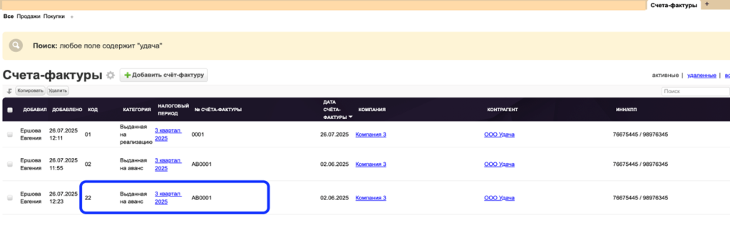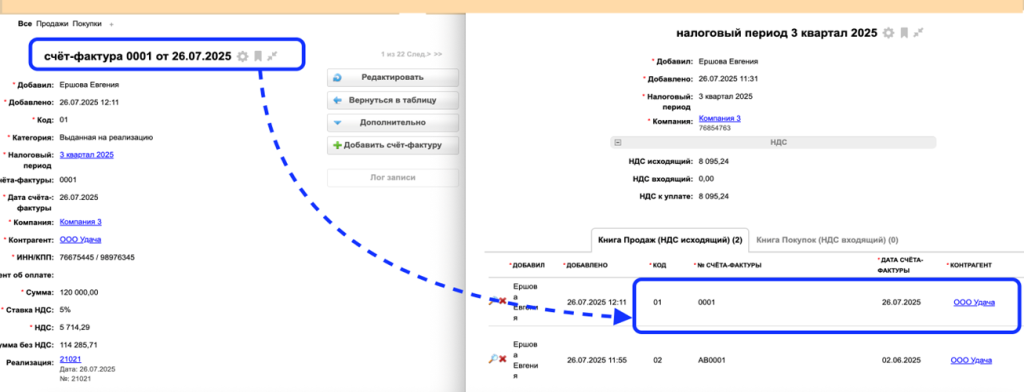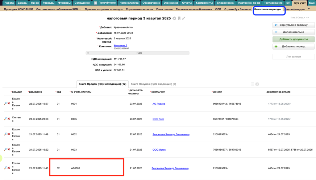 А также отображается в таблице "Налоговые периоды" в разделе "Книга продаж":