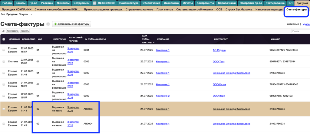 4. Проверить создание СФ на аванс