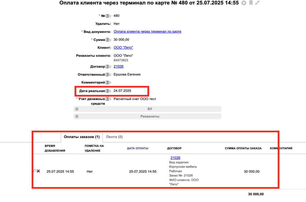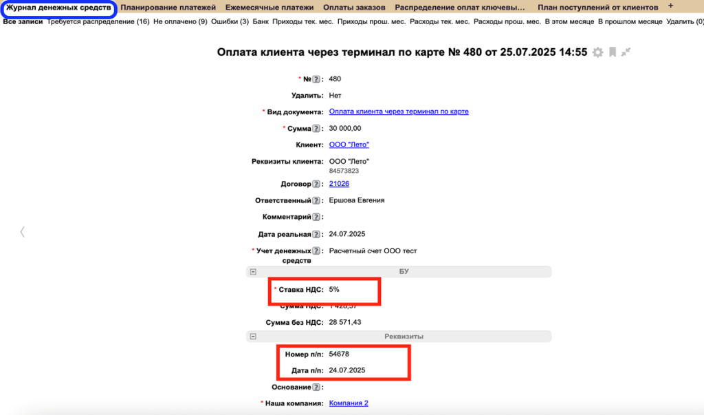 После выполнения доп действия оплата отображается в таблице "Журнал денежных средств".