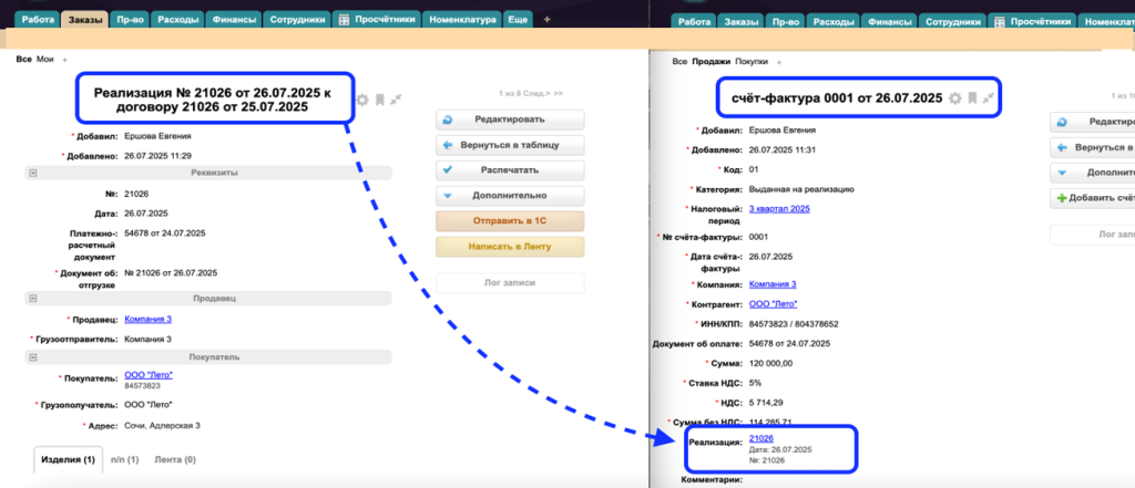 6. Проверить создание СФ выданного на реализацию