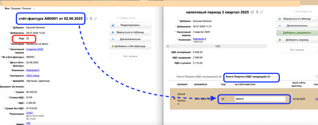 Также в таблице "Налоговые периоды" в разделе "Книга покупок" появляется запись по СФ выданному на аванс: