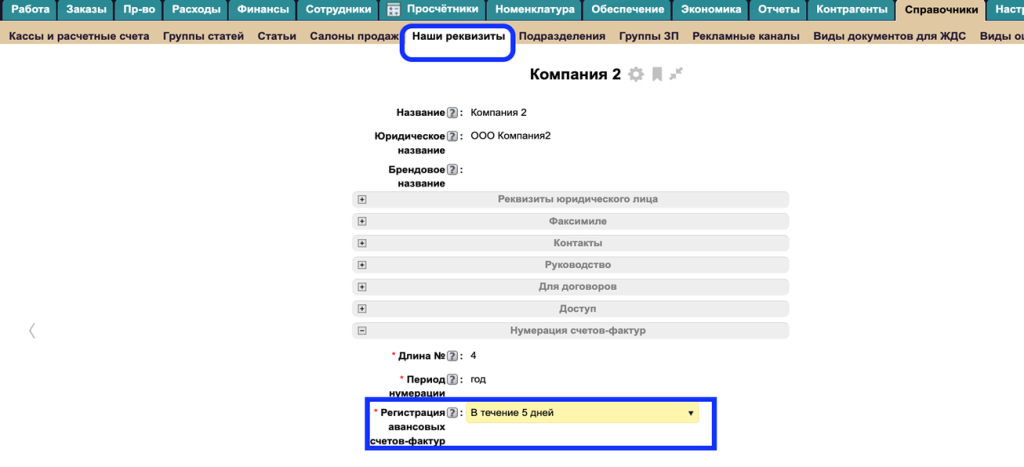 Далее формирование СФ выданных на аванс происходит автоматически согласно порядку Регистрации СФ на аванс, который указывается в справочнике "Наша компания".
