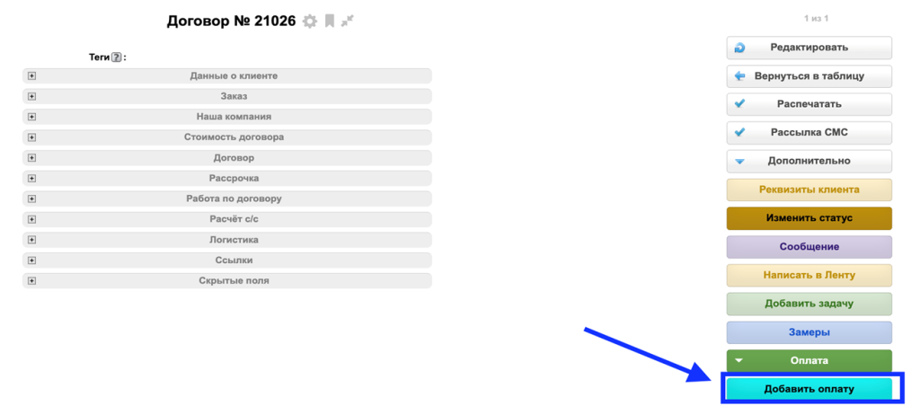 1. Оплаты от покупателей создаются в системе в таблице "Договоры" с помощью доп действия "Добавить оплату":
