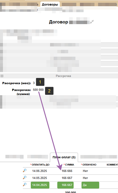 1. В поле "Рассрочка (мес)" указываем, на какое количество месяцев предоставлена рассрочка