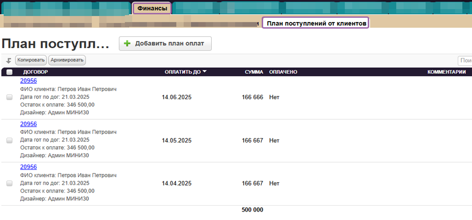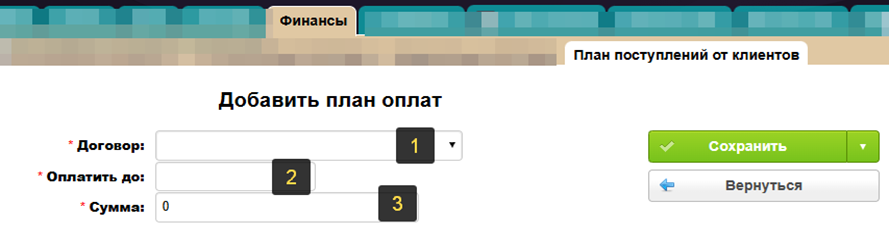 План поступлений от клиентов в системе "Бизнес в Плюсе"