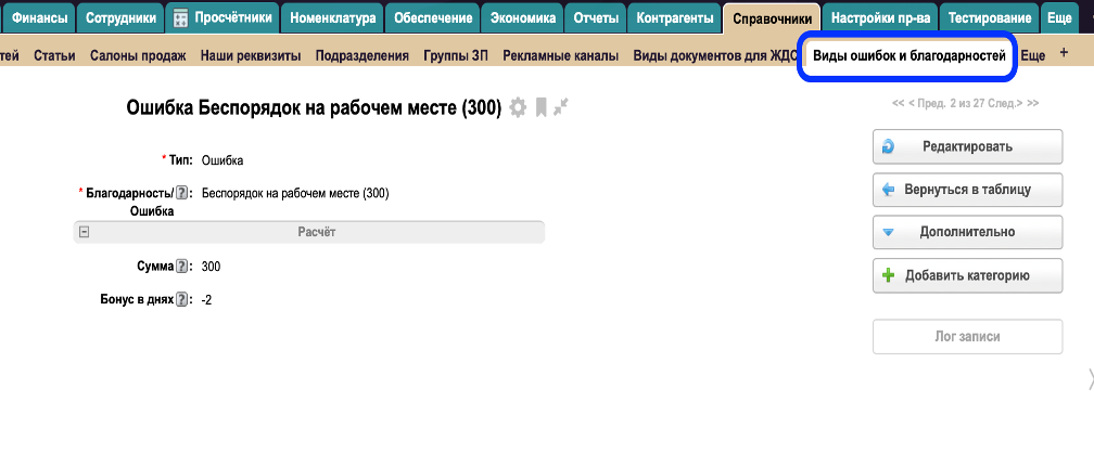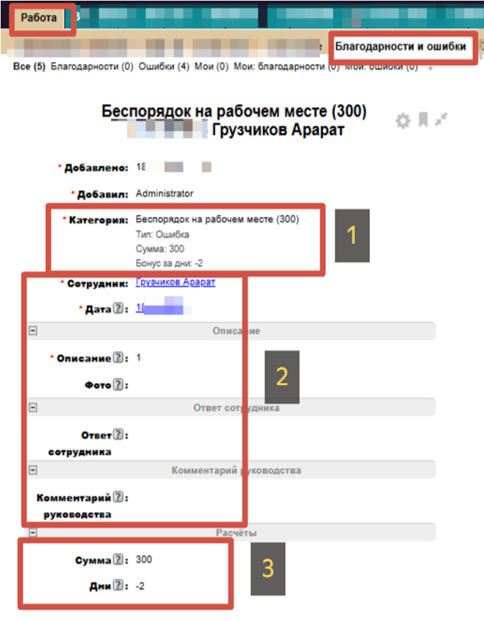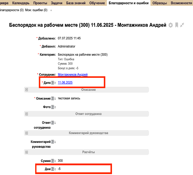 3. Значения в полях "Сумма" и "Дни" по умолчанию заполняются из справочника "Виды ошибок и благодарностей". При необходимости можно указать в настройках редактирование значений в данных полях. |