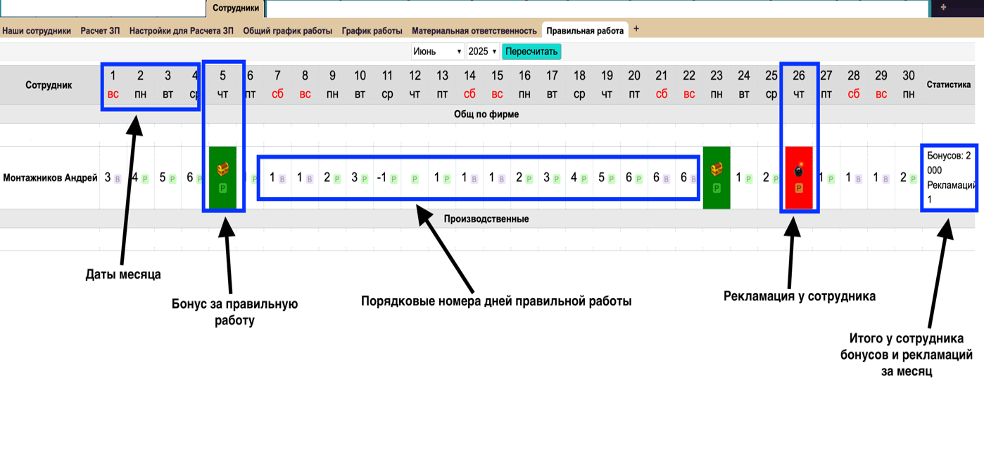 В отчёте "Правильная работа" отображается информация по кол-ву дней правильной работы, рассчитанным бонусам, рекламациям и ошибкам в разрезе сотрудников.