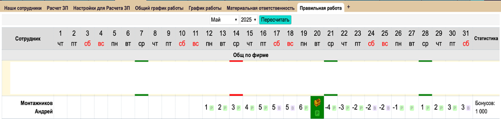 Настройка начисления бонусов за правильную работу происходит в таблице "Наши сотрудники" в группе Правильная работа, а также в поле "Настройки".