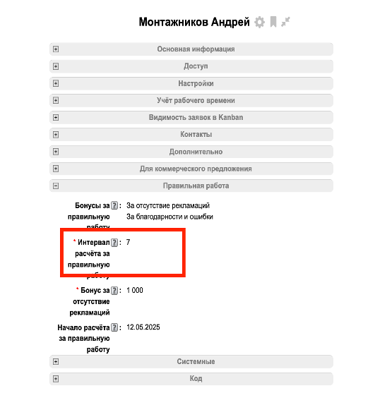 2. Интервал расчета за правильную работу. Указываем кол-во дней, за которое при правильной работе будет начисляться бонус.