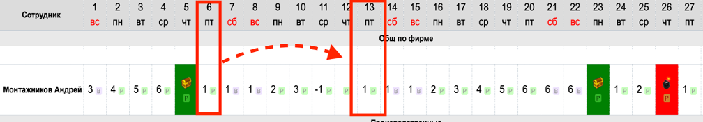 6. | Последний день периода правильной работы(день, когда сотрудник получает бонус)(сундук) |