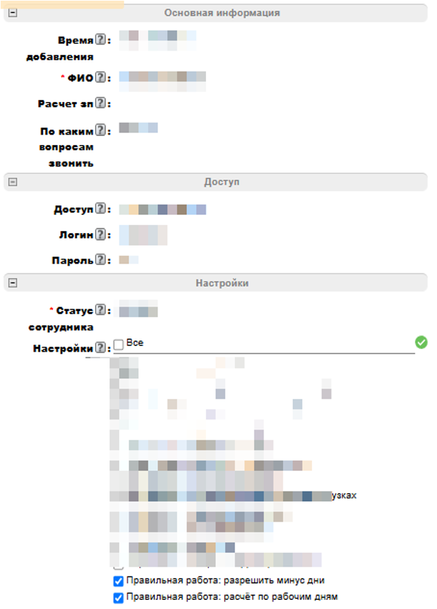 Также в поле "Настройки" в таблице "Наши сотрудники" необходимо выбрать варианты: