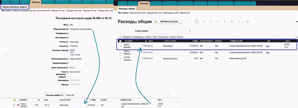 В эту таблицу поступает информация по расходам из таблиц "Журнал денежных средств", "Поступления" и другие.