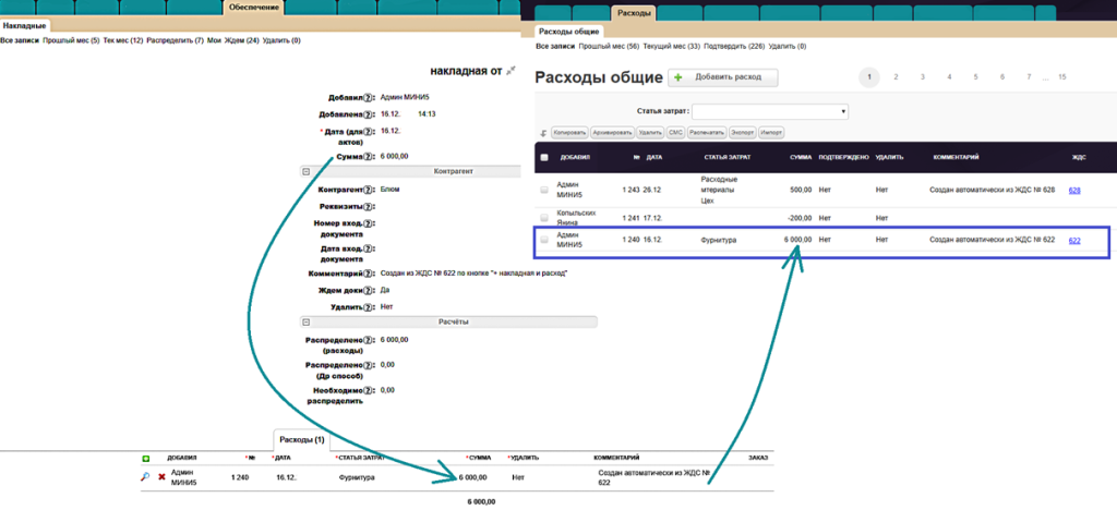 На каждого сотрудника создается отдельная запись в таблице "Расходы общие".