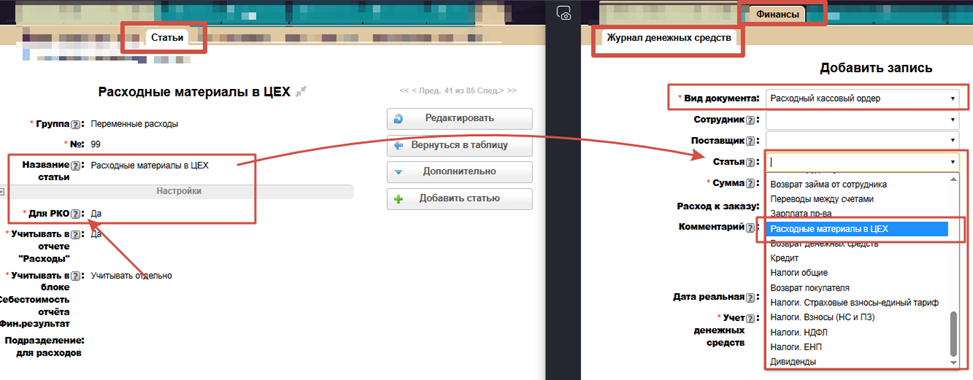 Если у статьи в поле "Для РКО" будет указано значение "Да", то данная статья будет отображаться в поле "Статья" в ЖДС: