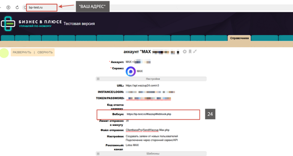 24. После сохранения убедитесь, что в поле «Вебхук» автоматически проставился адрес.
