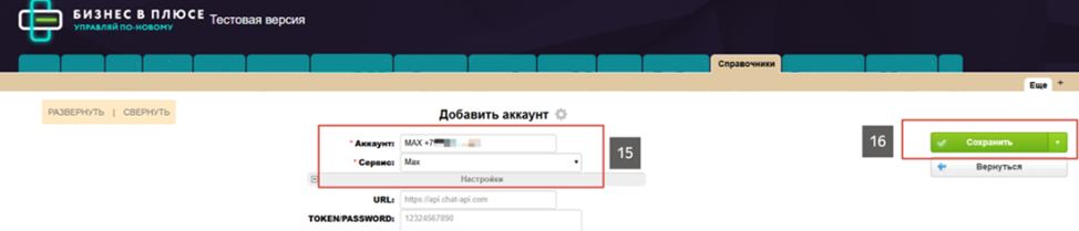 15. Добавляем в поле «Аккаунт» название канала, напр. МАХ +7961(номер телефона) и выбираем Сервис «MAX» из выпадающего списка