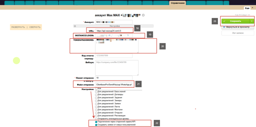 21. В поле «Файл отправки» вводим: ClientbasePro/SendWazzup.WhatsApp.php