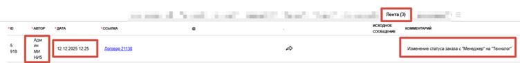 В подтаблице «Лента» появилась новая запись, в которой видим кто, когда и в какой статус перевел договор: