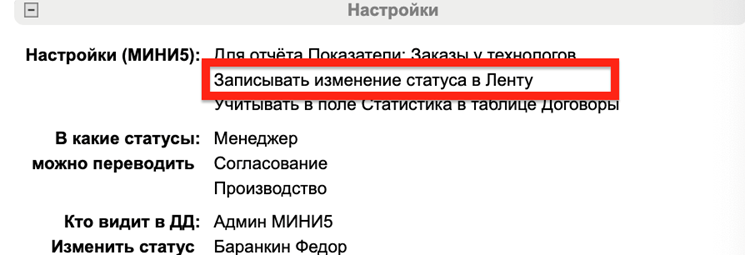 • Записывать изменение статуса в Ленту – при выборе настройки в Договоре в подтаблице «Лента» будут появляться записи, которые перешли в этот статус.