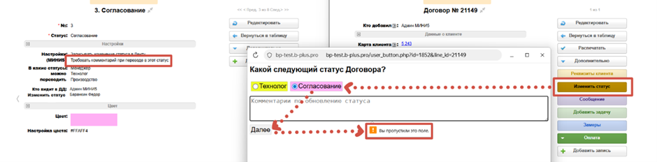 • Требовать комментарий при переводе в этот статус – при выборе этой настройки нельзя будет перевести договор в этот статус без указания комментария: