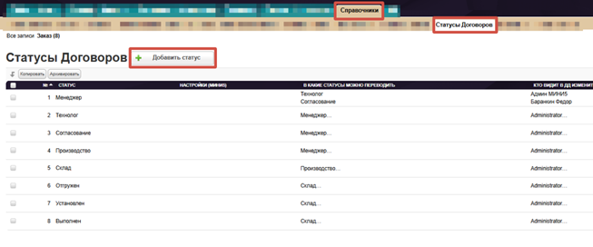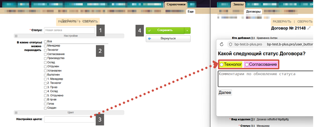 2. В какие статусы можно переводить — выбираем, в какие статусы можно будет переводить данный статус (например, менеджер может перевести статус из «менеджер» в «технолог»)