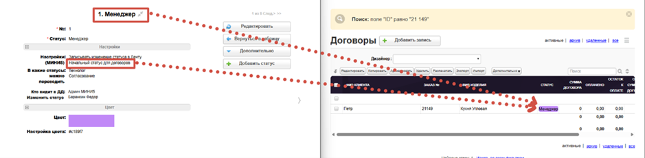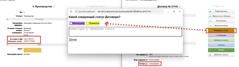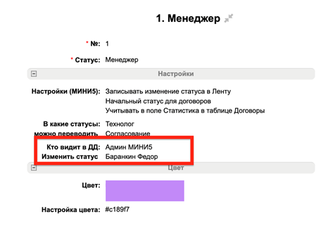 Например, в статусе "Производство" доступ отсутствует, а значит из статуса "Согласование" нельзя будет перевести договор в статус "Производство" без указания себя в поле "Кто видит в ДД Изменить статус":