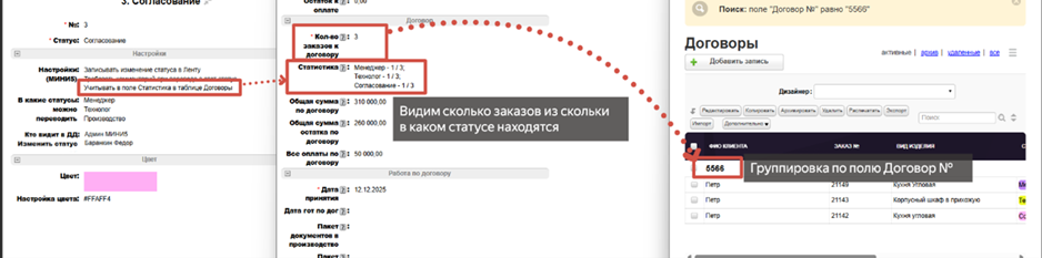 • Учитывать в поле Статистика в таблице Договоры – при выборе данной настройки, заказы в статусах с этой настройкой будут отображаться в поле «Статистика» (в этом поле отображаются заказы, объединённые одним номером договора, отображается сколько заказов в каких статусах находится)