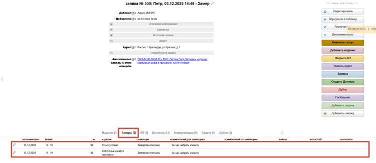 После создания Договора из Заявки, замеры отобразятся в таблице "Договор" в подтаблице "Замеры":
