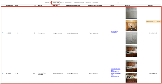 Новые записи появляются в таблице «Замеры» после выполнения ДД "Замеры" в таблице "Заявки" или "Договоры".
