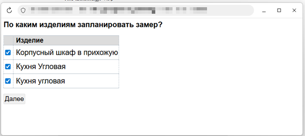 Нажимаем ДД Замеры. Если в заявке несколько изделий, то система предложит вам выбрать, по каким изделиям запланировать замер. Если необходимо запланировать замеры по всем изделиям, то нажимаем «Далее». Если не по всем- то убираем галочки с изделий, по которым замер не нужен, и нажимаем «Далее».