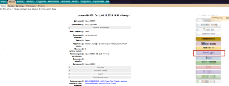 Перед добавлением записи в таблицу "Замеры" менеджер должен указать адрес и телефон клиента в таблице "Заявки".