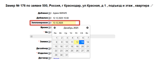 После получения уведомления о новом замере, назначенный замерщик может указать/изменить в этой таблице планируемую дату замера.