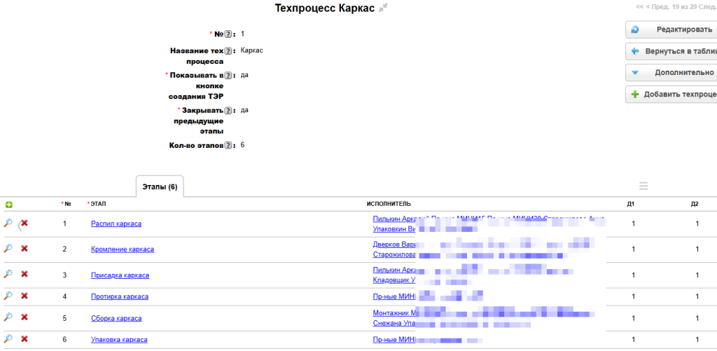 Техпроцесс производства может состоять из нескольких этапов. Например, в производстве мебели могут быть следующие техпроцессы: Каркас, Двери-купе, Фасады лакокраска и т.п.