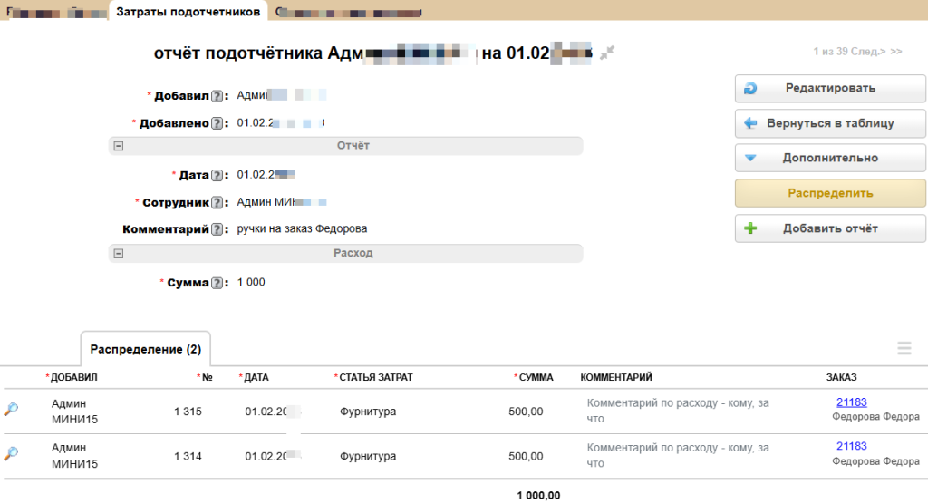 1. Указана сумма затрат подотчетника, которую необходимо распределить.