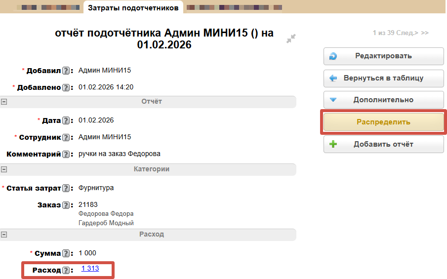 Отображается ДД "Распределить". Оно дает возможность распределить потраченную подотчетником сумму на расходы по определенным статьям.
