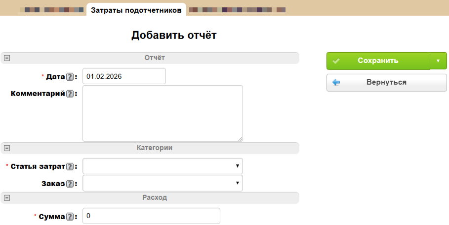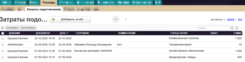 Затраты подотчетников в системе "Бизнес в Плюсе"