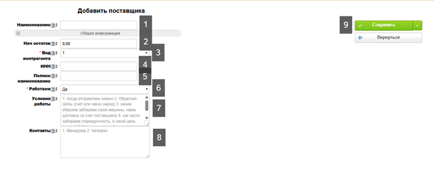• 8. Контакты — Указываем контакты поставщика (телефон, адрес).