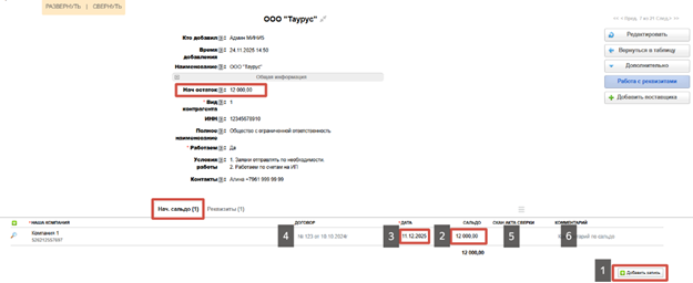 • 2. Нач. остаток — Указываем начальной остаток по взаиморасчетам для отчета "Акт сверки с поставщиками".