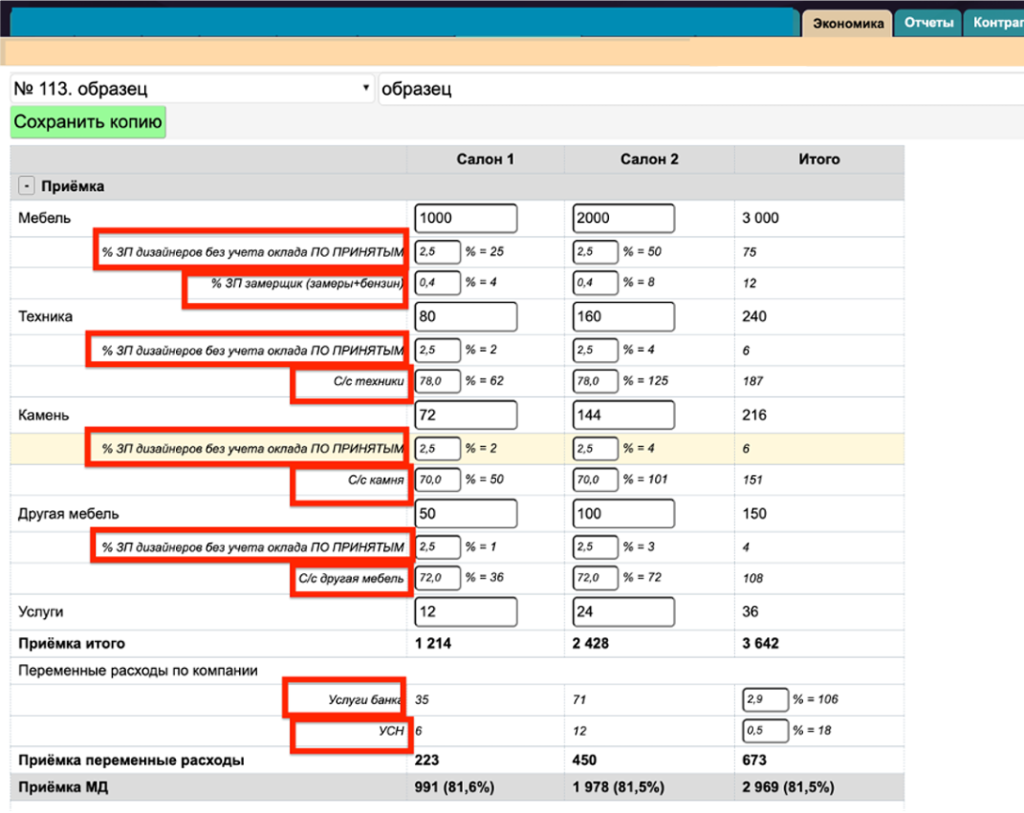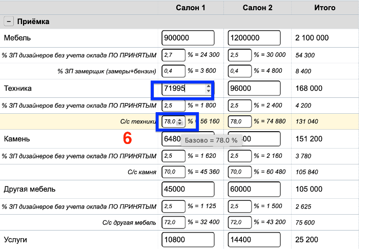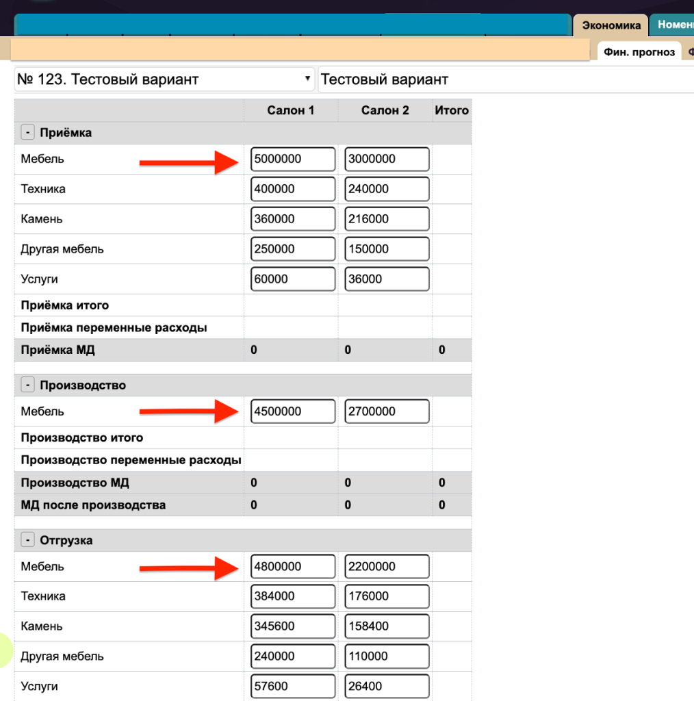 3. Далее указать предполагаемые суммы приемки, производства и отгрузки по базовому направлению деятельности (в нашем примере направление Мебель) для каждого источника продаж (Салон1, Салон2). Суммы по остальным направлениям (Техника, Камень, Другая мебель, Услуги) рассчитаются автоматически согласно %, указанному в таблице ФП-категории в поле «% базовой категории».