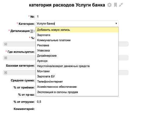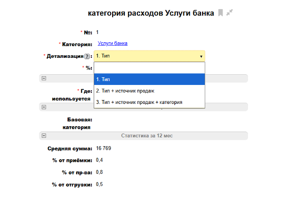 5. В поле «Базовая категория» указываем категорию (направление деятельности) для статей расходов, у которых в поле «Детализация» выбран вариант «3. Тип + источник продаж + категория». Сумма по данной статье будет рассчитываться для каждой из указанных базовых категорий: