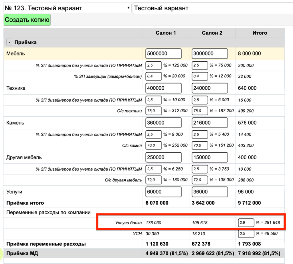 5. После этого в отчете автоматически рассчитаются и отобразятся суммы по всем статьям расходов, которые добавлены в таблицах «ФП-переменные расходы» и «ФП-постоянные расходы».