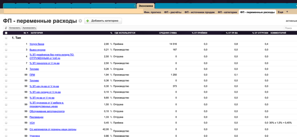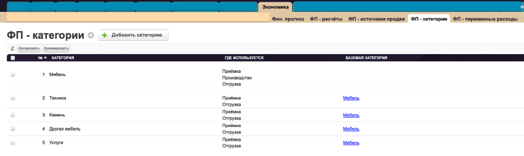 Таблица расположена в категории «Экономика». ФП-категории- это направления деятельности, от которых компания получает прибыль (например, продажа Мебели, Техники, Коммерческие услуги и т.п).