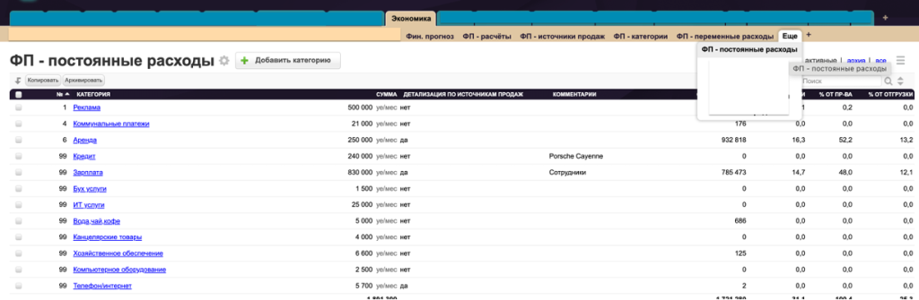 После заполнения данных по постоянным расходам, обновляем расчёт. Все постоянные расходы отобразятся в отчете «Фин. прогноз».