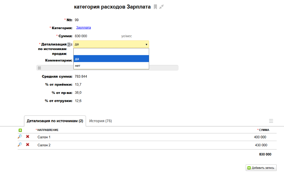 При нажатии на лупу слева от источника продаж можно перейти в более подробную детализацию расхода и указать, например, окладные части зарплат сотрудников: