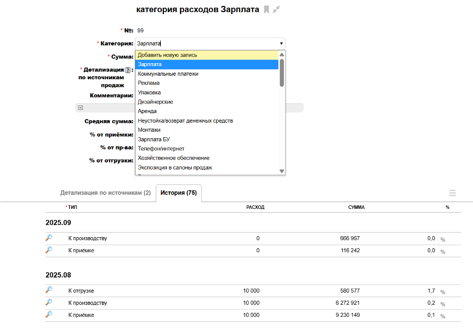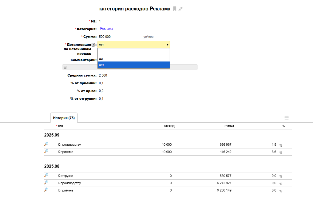 Значения полей «Средняя сумма», «% от приёмки», «% от пр-ва», «% от отгрузки» поступают из подтаблицы «История».