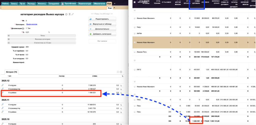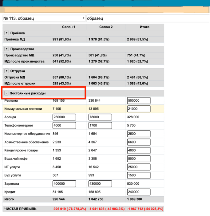 3. Тип + источник продаж + категория - сумма расхода распределяется на тип деятельности (приёмка/производство/отгрузка), источник продаж (салон) и категорию (направление деятельности).