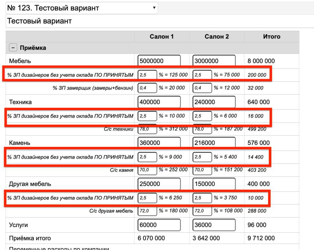 Например, отображение в отчете "Фин. прогноз" суммы по статье «% ЗП дизайнеров без учета оклада по принятым»: