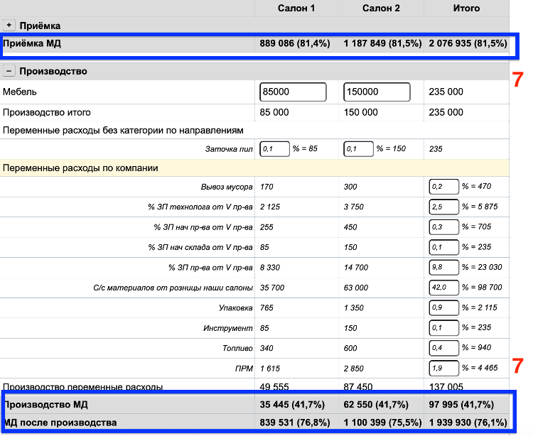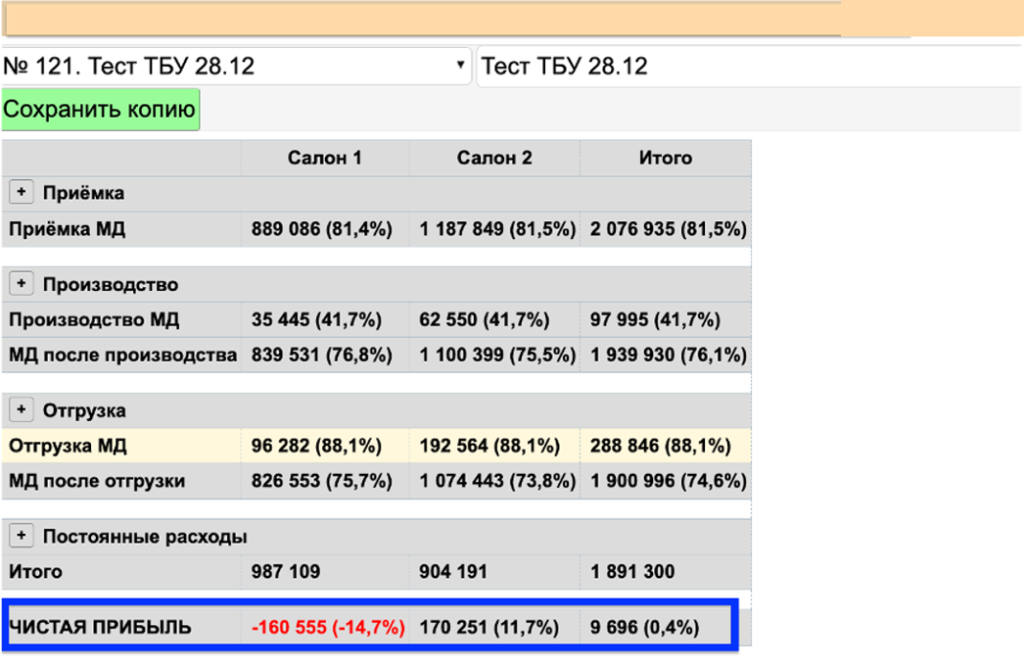 6. При необходимости можно изменять суммы по приемке, производству, отгрузке и/или изменять сумму расходов/% расходов непосредственно в отчете, нажимать «Обновить» и наблюдать изменение показателей по маржинальному доходу и чистой прибыли.
