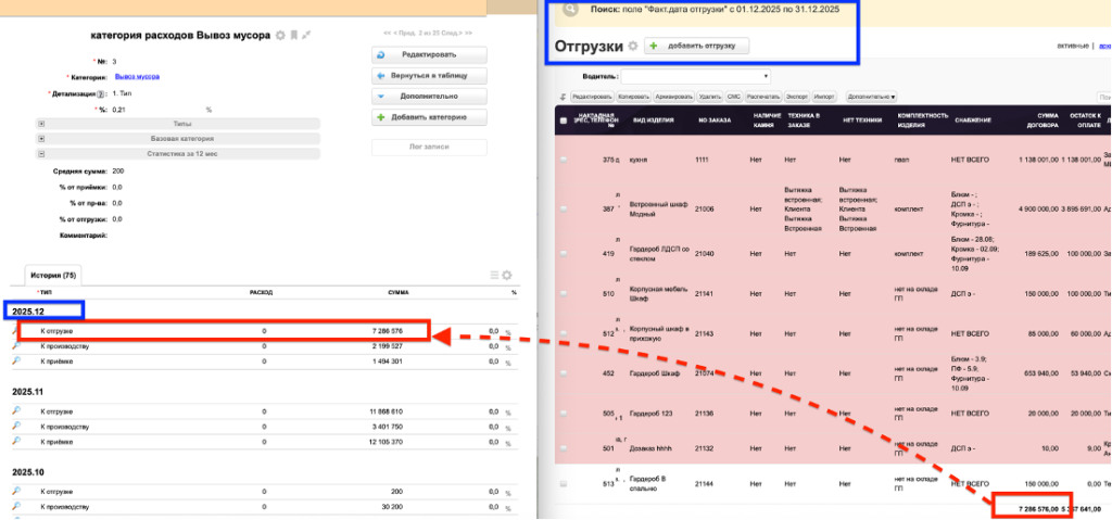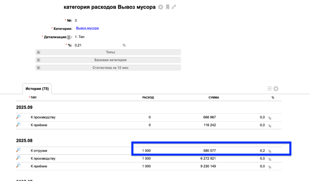Например, для статьи расхода «Вывоз мусора» за авг.2025=1000/580577*100=0,2 %