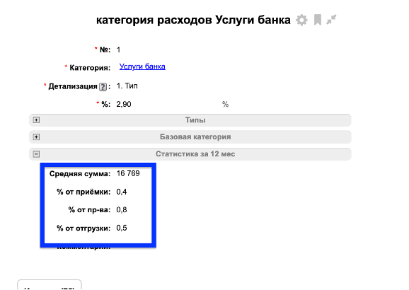 После того, как системе появились данные по расходам, автоматически рассчитывается Средняя сумма расходов за 12 месяцев (из таблицы «Расходы общие») и среднее процентное соотношение к типам (приёмка, производство, отгрузка). Если данных по этой статье расходов нет за 12 месяцев, то рассчитается среднее значение пропорционально кол-ву месяцев от даты самого первого расхода по этой статье.
